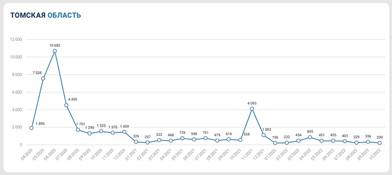 Максимальное количество мер (фактов) поддержки субъектов МСП в Томской области было зафиксировано в июне 2020 года (10 682 ед.), при этом уже в следующем месяце показатель снизился до 4 495 ед. Минимум пришелся на январь 2022 года (196 ед.), еще один всплеск – на ноябрь 2021-го (4 093 ед.).