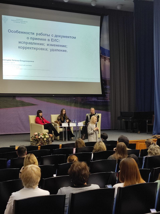 С докладом «Особенности работы с документом о приемке в ЕИС: исправление; изменение; корректировка; удаление» выступила Наталья Казанцева – начальник отдела функционирования контрактной системы УФК по Томской области.