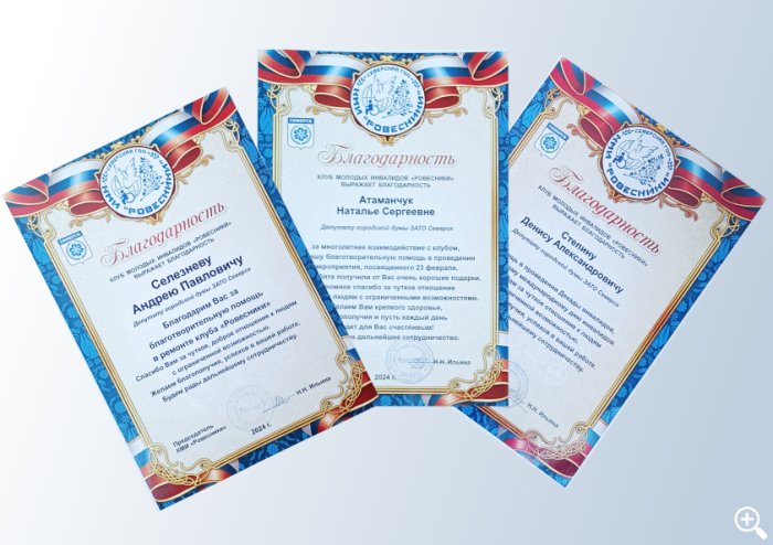 Вот и опять в северскую Думу поступили Благодарственные письма. В этот раз от клуба молодых инвалидов «Ровесники» за подписью его председателя Натальи Ильиной. Они предназначены для депутатов Натальи Атаманчук, Андрея Селезнева и Дениса Степина. В письмах члены клуба выражают признательность и благодарность адресатам за многолетнюю дружбу, чуткое отношение к людям с ограниченными возможностями, оперативную помощь в проведении праздничных мероприятий, в ремонте клуба.
