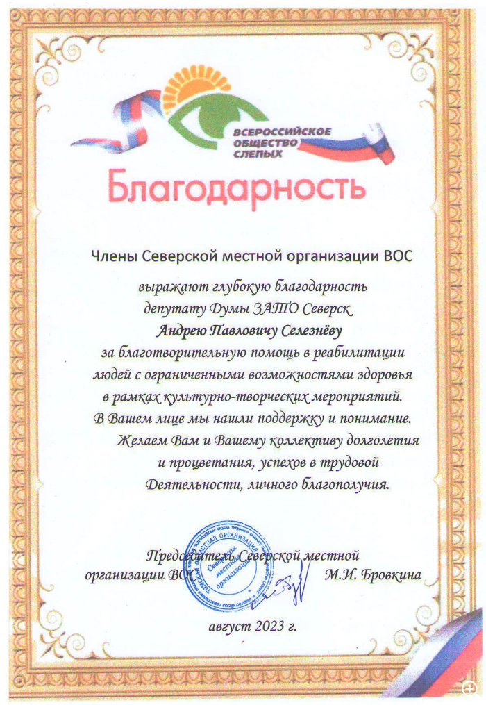 В послании выражается глубокая благодарность депутату Думы Андрею Селезневу за благотворительную помощь в реабилитации людей с ограниченными возможностями здоровья в рамках культурно-творческих мероприятий. В письме отмечается: «В Вашем лице мы нашли поддержку и понимание».