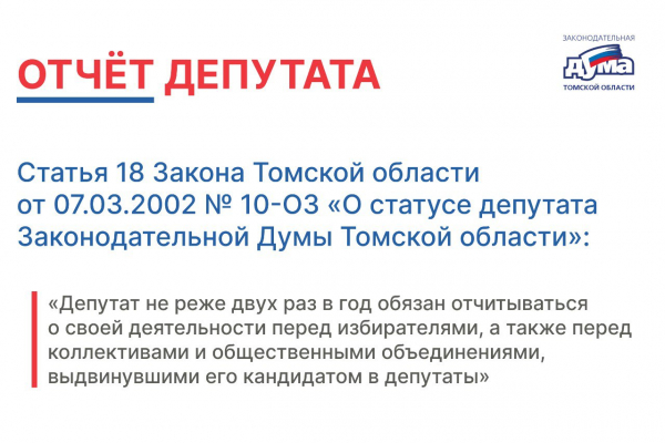 Согласно действующему законодательству депутат отчитывается о своей депутатской работе перед избирателями не реже двух раз в год. Отчеты публикуются на персональной странице депутата на сайте в разделе «Депутаты» .