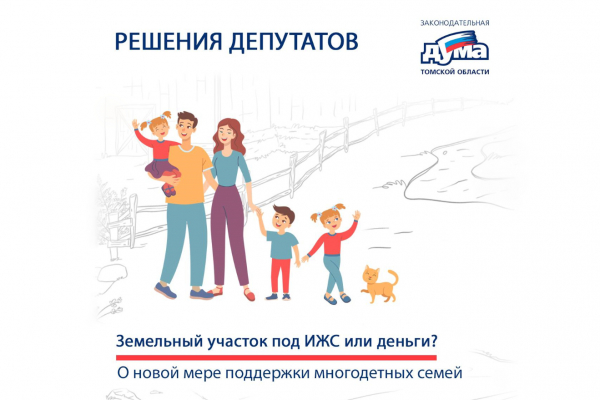 Многодетные семьи, до 1 марта 2023 года вставшие в очередь на получение бесплатно земельного участка под ИЖС, с 2024 года смогут вместо земли получить денежную выплату. Такое решение приняли депутаты Законодательной Думы Томской области, поддержав инициативу областной прокуратуры. Максимальный размер выплаты - 300 тысяч рублей.