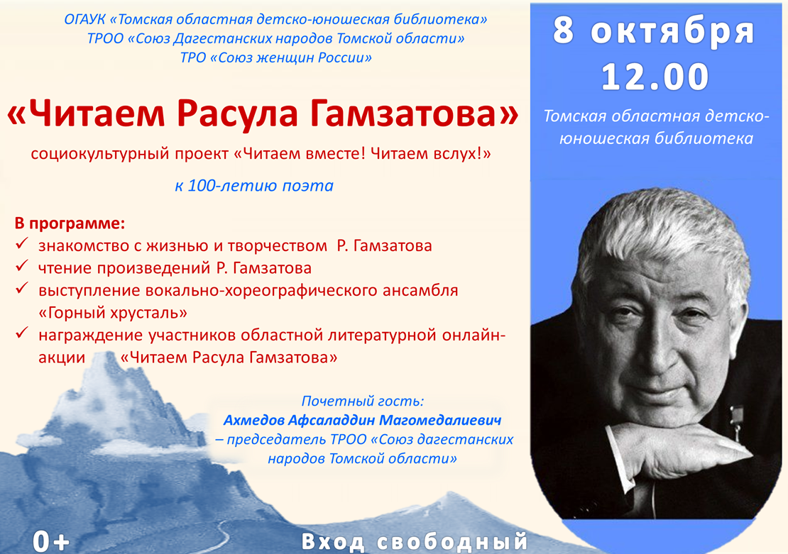 8 октября в 12.00 в Томской областной детско-юношеской библиотеке в рамках социокультурного проекта «Читаем вместе! Читаем вслух!» состоятся открытые публичные чтения «Читаем Расула Гамзатова». Мероприятие посвящено 100-летию со дня рождения писателя.