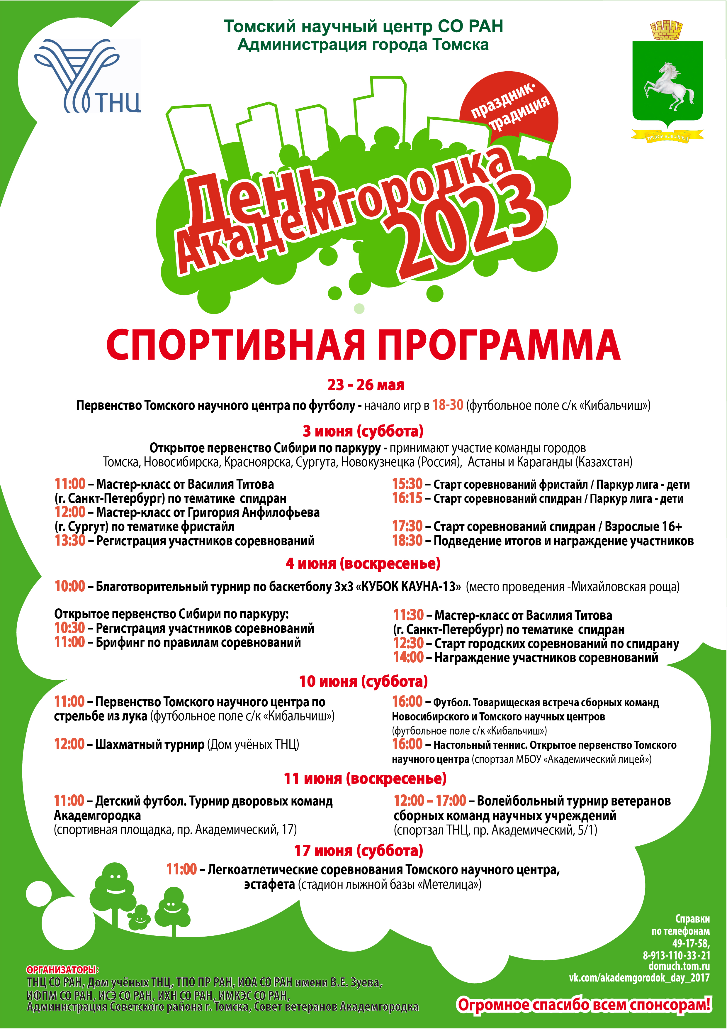 4 июня, в первое воскресенье лета, в спортивной программе праздника-традиции "День Академгородка-2023" в спортивном зале спортклуба "Академик" состоялись игры по волейболу. Принимали участие 3 команды: команда ТУСУРа, команда ИФПМ СО РАН и сборная Академгородка с говорящим названием "Убойный отдел". Играли три партии до 2 очков, места распредились следующим образом: