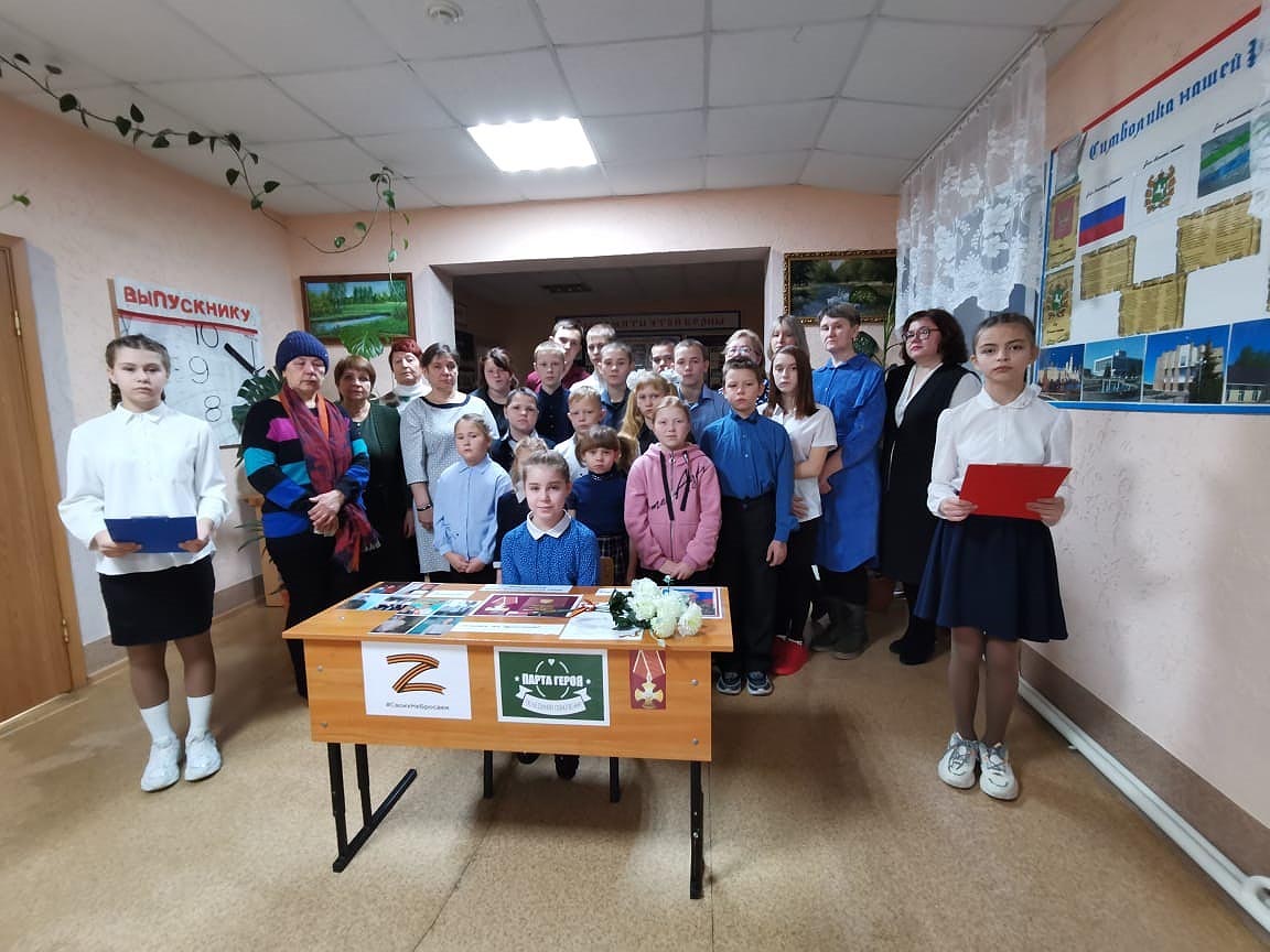 Врио директора школы Ю.С. Медведева рассказала о Всероссийском образовательном проекте «Парта Героя» и о выпускнике Альмяковской школы Сергее Новикове, который, выполняя воинский долг, участвовал в специальной военной операции на Украине.