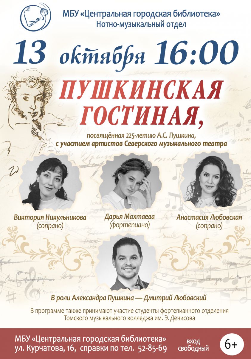 Дорогие наши читатели и ценители музыки, 13 октября в 16:00 мы приглашаем вас на литературно-музыкальную гостиную "Пушкин и музыка" с участием артистов Северского музыкального театра.