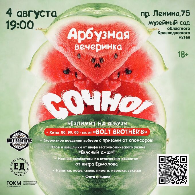 4 АВГУСТА в 19:00 ДЛЯ ВСЕХ ЛЮБИТЕЛЕЙ АРБУЗНОЙ СВЕЖЕСТИ И СОЧНОСТИ ВЕЧЕРИНОК УСТРАИВАЕМ В МУЗЕЙНОМ САДУ ДИСКО ПОД ЗАЖИГАТЕЛЬНЫЕ РИТМЫ 80-90-00-Х В ПОТРЯСАЮЩЕЙ ИНСТРУМЕНТАЛЬНОЙ ОБРАБОТКЕ МУЗЫКАЛЬНОЙ КОМАНДЫ Bolt Brothers | Кавер-группа Томск | Сибирь