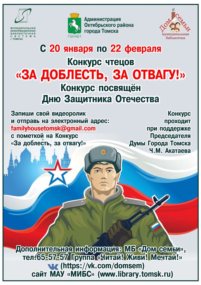 До 17 февраля муниципальная библиотека « Дом семьи » (ул. Железнодорожная, 32) ведёт приём заявок на конкурс юных чтецов «За доблесть, за отвагу!» , посвящённый Дню защитника Отечества. Для участия п риглашаются жители Октябрьского района , которые должны прочесть перед камерой стихотворения, посвящённые празднику, и предоставить свои видеоролики на суд жюри. Конкурс проводится при поддержке Администрации Октябрьского района Города Томска. Чтение патриотических стихотворений русских авторов станут данью уважения российскому солдату и военной службе, выражением любви к Родине. Короткие ролики (1-3 минуты) с декламацией будут оценены компетентным жюри в 4-х возрастных группах: дошкольники от 4 до 7 лет, младшие школьники от 7 до 10 лет, школьники среднего звена от 11 до 14 лет, подростки и взрослые от 15 лет и старше. Победители конкурса будут отмечены дипломами и призами от организаторов конкурса.