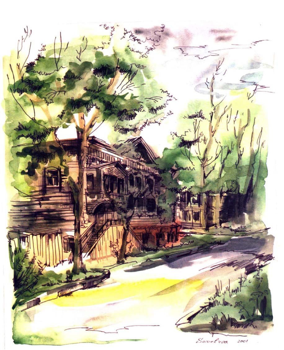 На изображениях: 1 – Томск, ул. Никитинская, 15, Томский учительский институт, 1902-1904 гг. Рисунок Н. Савельевой и 2 – Корпус на Киевской (архитектор Ф. Гут)
