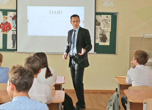 Встреча с семиклассниками школы №7 у него вторая или третья по счёту. Но первая в новом учебном году. Так или иначе ребята не забыли прошлогодних уроков. Без запинки отвечают: