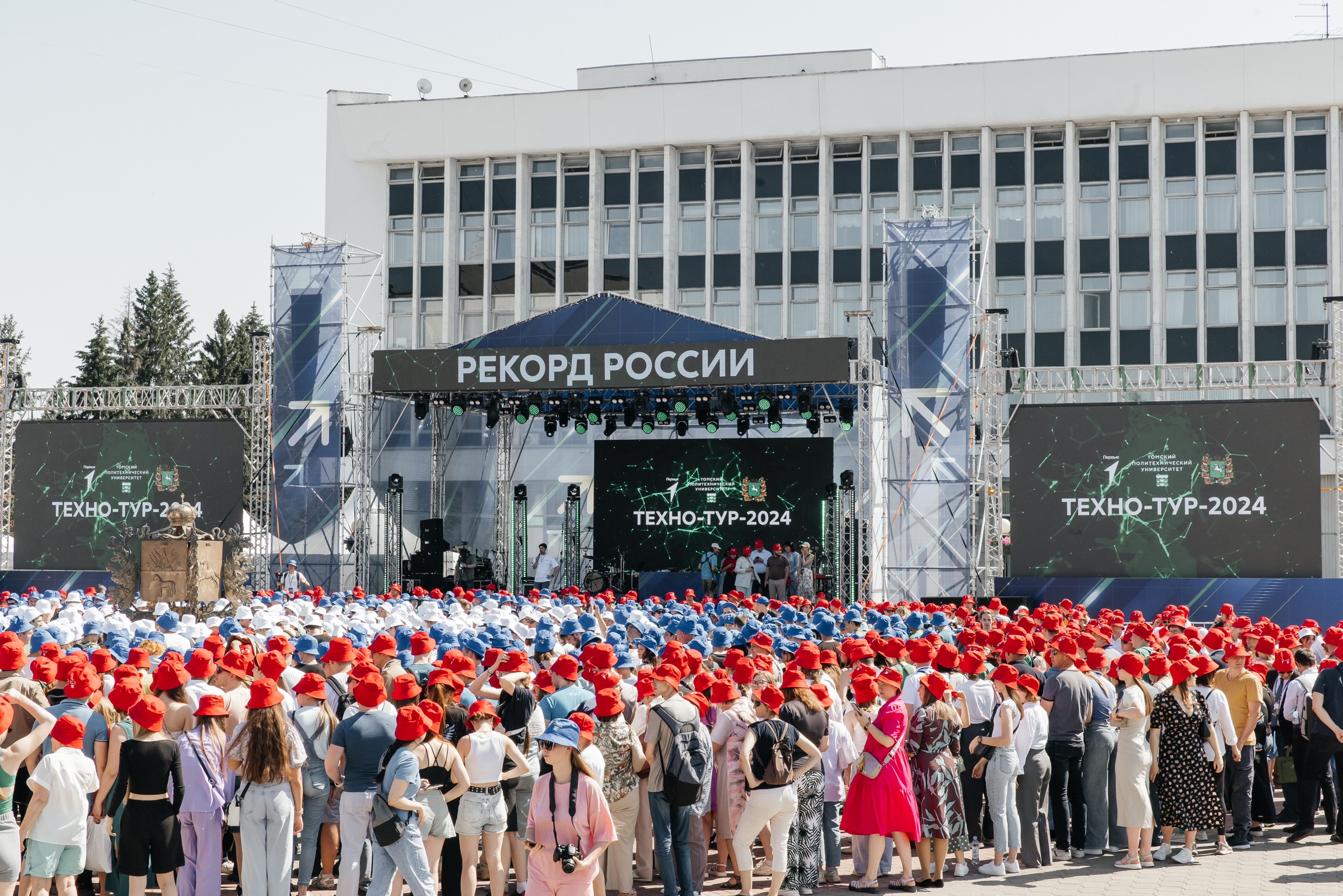 На площадке молодежного технологического фестиваля «Техно-тур 2024», который сегодня, в День России, проходит в центре Томска, был установлен рекорд России на самый массовый хоровод «круг в круге» из наибольшего количества людей в головных уборах, составляющих цвета Государственного флага РФ. Единовременно в нем приняли участие 2 638 человек.