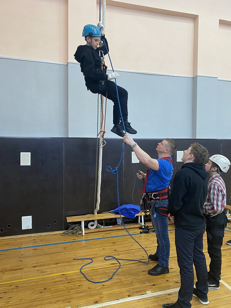 Далее прошел профориентационный интенсив, организованный по принципу викторины с тремя станциями. На первой школьники с помощью практикующих спасателей научились вязать туристские узлы, познакомились с альпинистским снаряжением и попробовали правильно и безопасно его использовать. В спортивном зале школы ребята выполняли вертикальный подъем с помощью жумара и спуск с использованием фрикционного страховочного устройства.