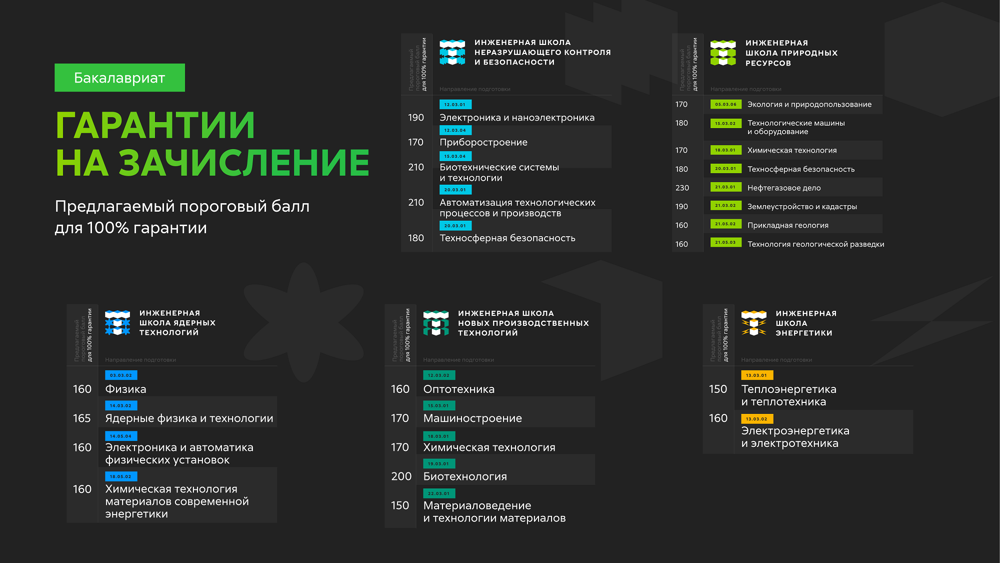 В вузе приняли решение расширить список направлений подготовки, которых коснется акция. Сейчас предложение распространяется на 22 направления в пяти инженерных школах: Инженерной школе ядерных технологий, Инженерной школе неразрушающего контроля и безопасности, Инженерной школе природных ресурсов, Инженерной школе новых производственных технологий и Инженерной школе энергетики.