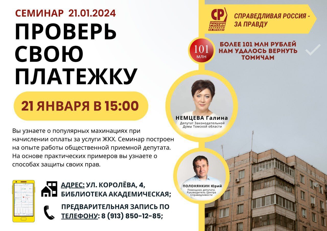В воскресенье, 21 января, в библиотеке Академическая состоится один из самых популярных семинаров по повышению правовой грамотности населения, которые проводят в Томской области представители партии СПРАВЕДЛИВАЯ РОССИЯ – ЗА ПРАВДУ . "Проверь свою платежку" призывают справороссы и рассказывают томичам о самых распространенных уловках и махинациях при начислении оплаты за услуги ЖКХ.