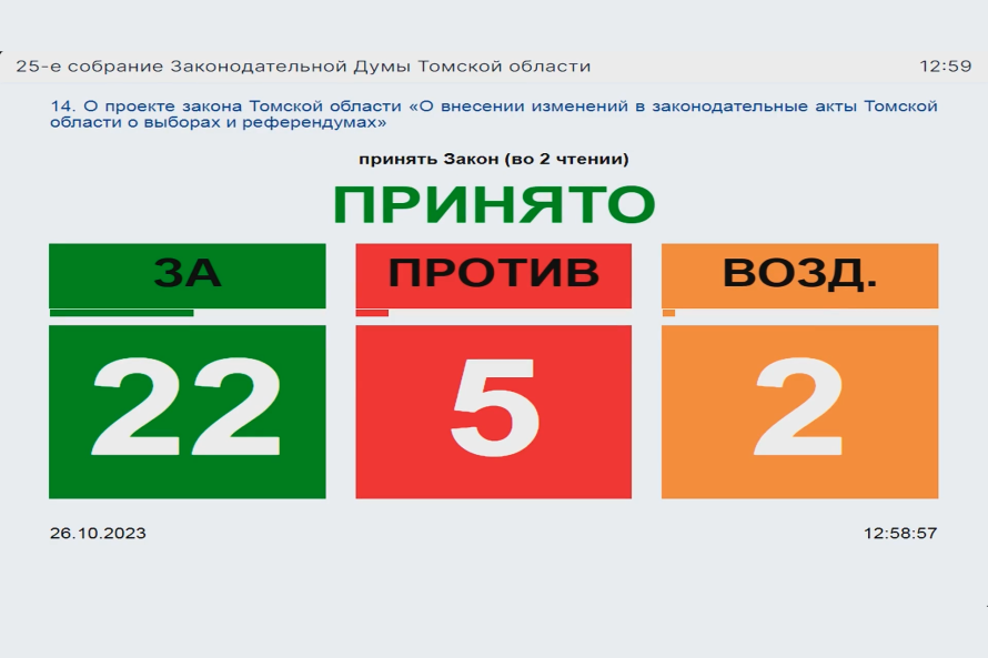 На 25 собрании Законодательной Думы Томской области депутаты 22 голосами за приняли во втором чтении поправки в региональное законодательство о выборах.