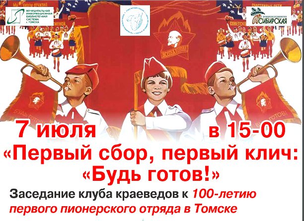 7 июля в 15-00 в библиотеке «Сибирская» (ул. Колхозная, 9/1) состоится открытое заседание клуба краеведов «Первый сбор, первый клич: «Будь готов!» к 100-летию первого пионерского отряда в Томске.