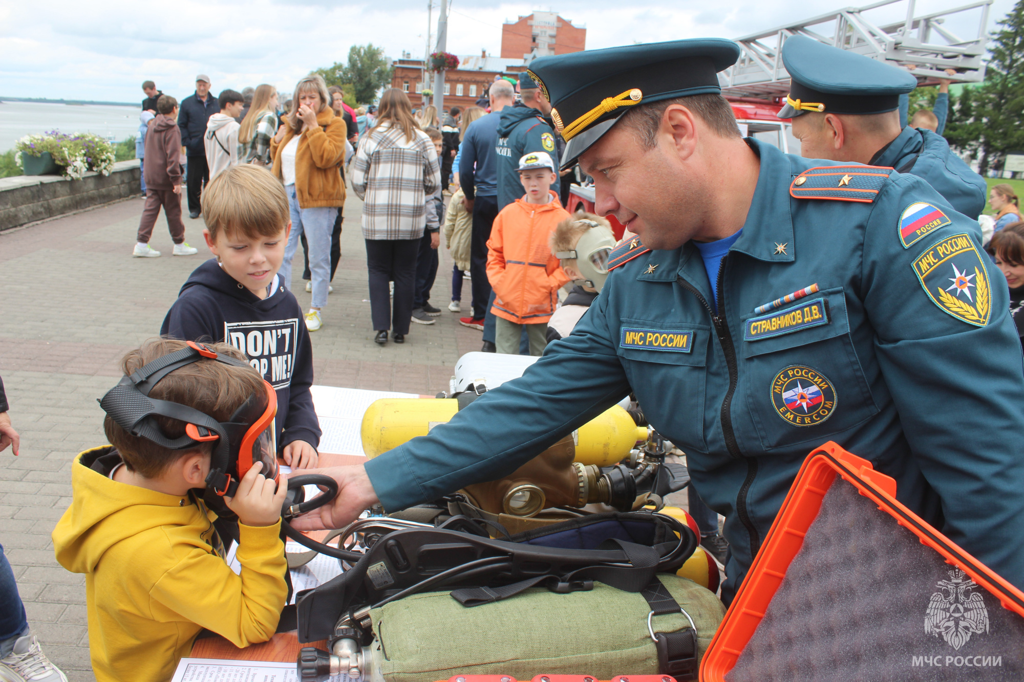 Программу праздника скрасили конкурсы для детей и взрослых: сбивание мишени напором воды из пожарного рукава, надевание боевой одежды пожарного и многое другое.