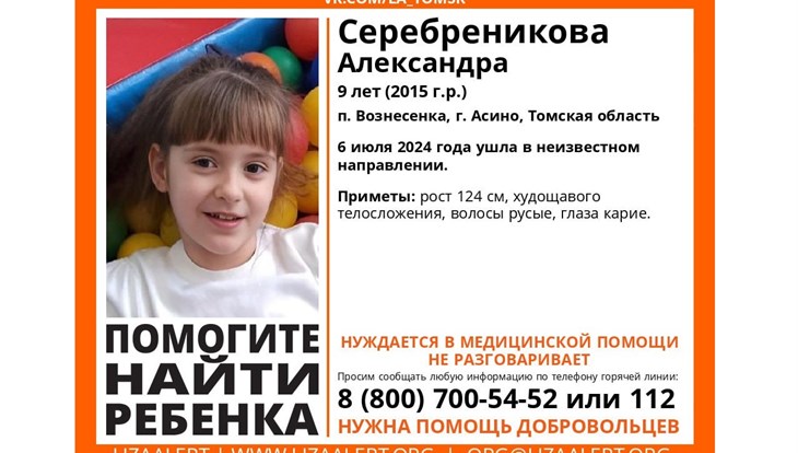 "Поселок Вознесенка, Асино! Пропала Серебреникова Александра, 9 лет (2015 год рождения). 6 июля 2024 года ушла в неизвестном направлении. Нуждается в медицинской помощи, не разговаривает", – говорится в сообщении.
