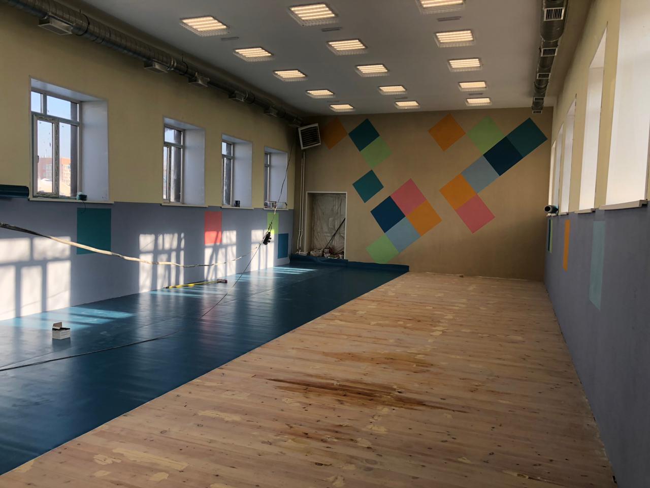 В помещении пристройки к школе №16 рабочие завершают отделку, ведут клининг и укладывают напольное покрытие в спортале.