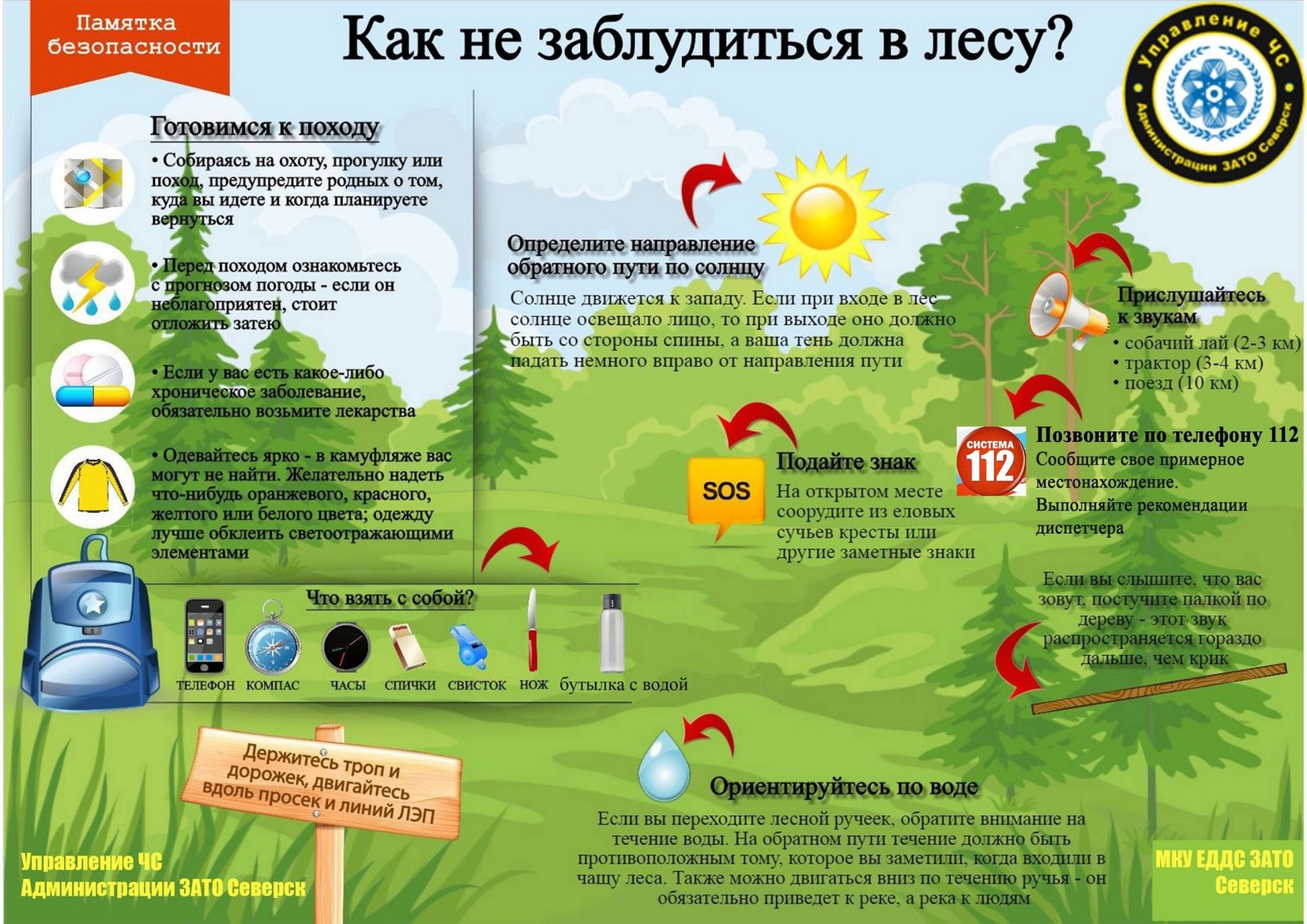 2. При себе рекомендуется иметь заряженный мобильный телефон, механические или кварцевые наручные часы (у них имеются стрелки), навигатор (компас), спички, нож, фонарик, питьевую воду, продукты питания.