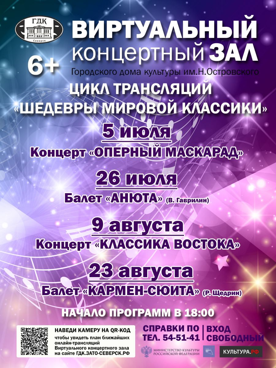 Летом 2023 года в Виртуальном концертном зале Городского дома культуры им.Н.Островского для всех любителей и ценителей классической музыки и искусства пройдет цикл онлайн-трансляции концертов и балетов под общим названием «Шедевры мировой классики».