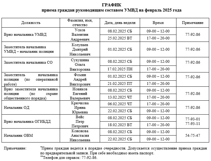 График приема граждан руководящим составом УМВД на февраль 2025 года