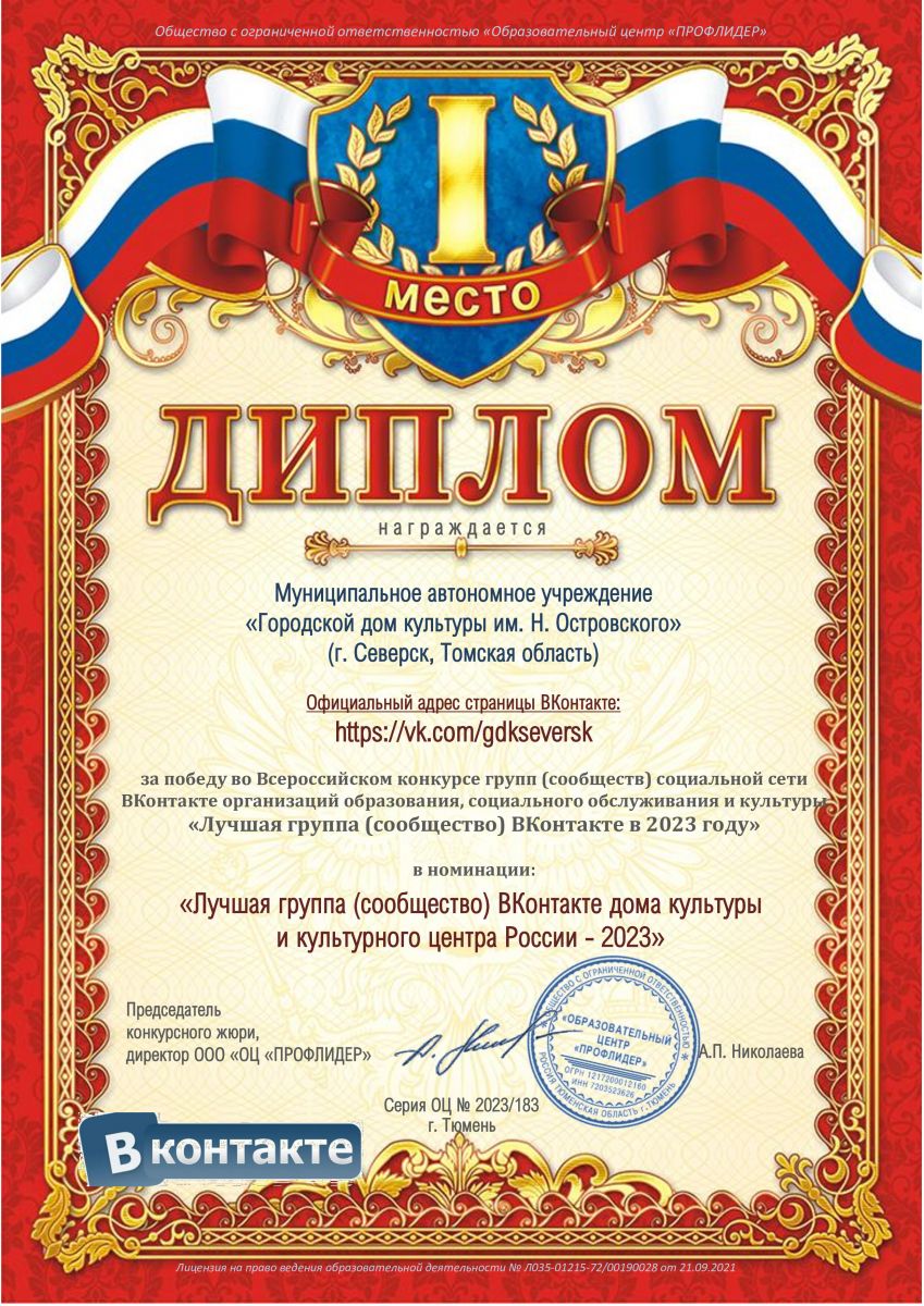 Официальная группа учреждения в социальной сети «ВКонтакте» проходила оценку по таким критериям, как оформление группы, наличие отметки «Госорганизация», актуальность и оформление новостной ленты, актуальность контактной информации и др. По результатам оценки группа Дома культуры https://vk.com/gdkseversk получила 30 баллов и заняла 1 место в номинации «Лучшая группа (сообщество) ВКонтакте дома культуры и культурного центра России – 2023».