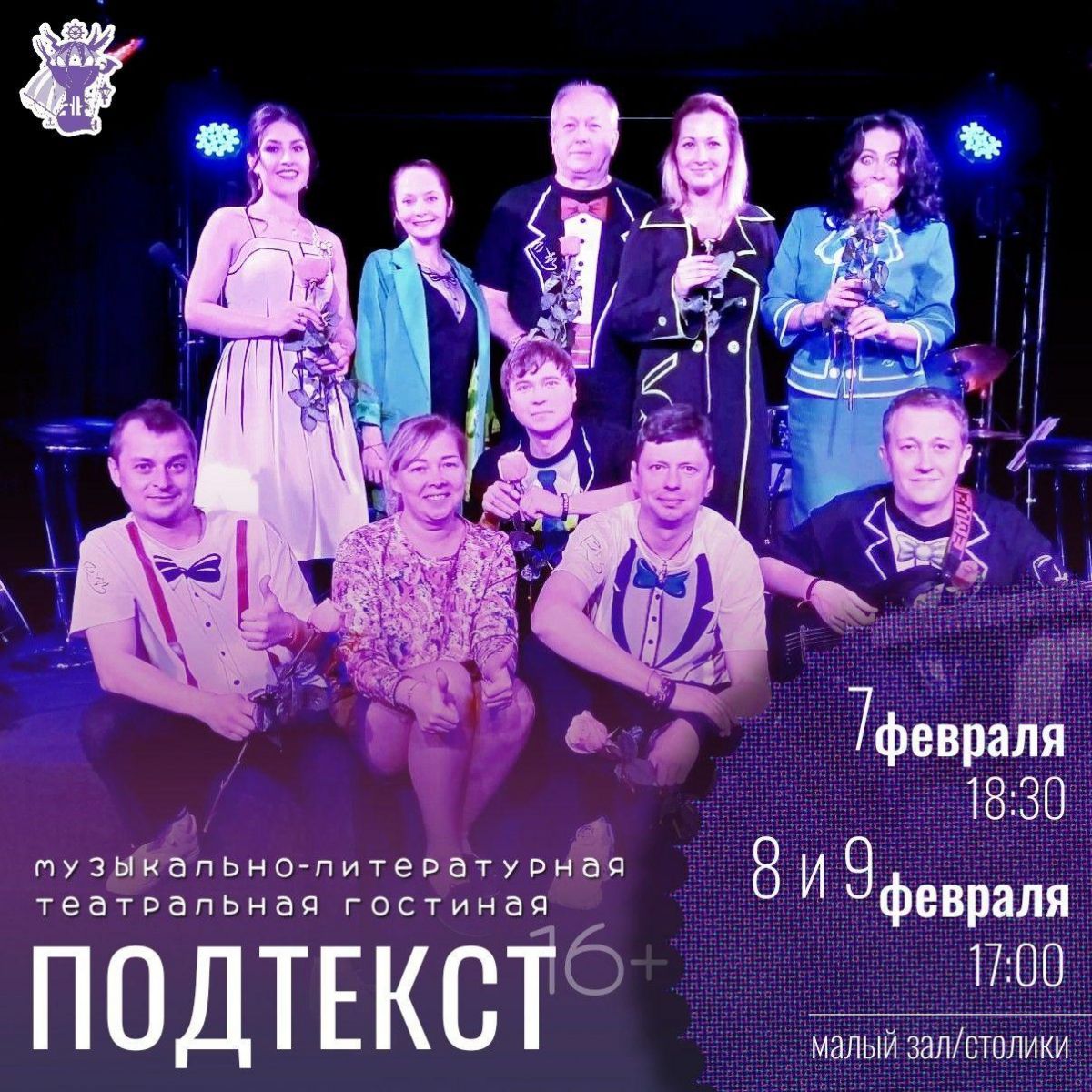 7 февраля, 18:30; 8, 9 февраля, 17:00. «Подтекст» (музыкально-драматический актерский перфоманс, малый зал, 16+).