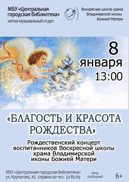 Праздник Рождества – один из любимых праздников народов России. Обращение к традициям его празднования имеет огромный потенциал для духовно-нравственного воспитания подрастающего поколения. Этот день на Руси всегда старались проводить с родными и близкими, а также дарить особенные душевные подарки. Такой подарок для горожан приготовили воспитанники Воскресной школы. Мы с удовольствием ждем вас в нашей библиотеке. Праздник придется по душе и взрослым, и детям!