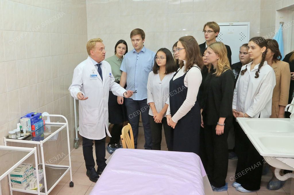 — Ещё хирургу обязательно иметь большое терпение. У него должен быть «подвижный» ум, — говорит Игорь Владимирович. Особенно внимательно к разговору о профессиональных составляющих прислушиваются Полина Вагнер и Никита Баранов. Они хотят обучаться по специальности «хирургия».