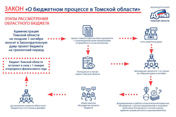 После внесения проект регионального бюджета обсуждается депутатами на заседаниях всех пяти комитетов думы, а также направляется в Контрольно-счетную палату Томской области, областную прокуратуру и Минюст РФ по Томской области.