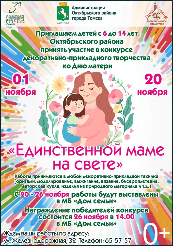 С 1 по 22 ноября в муниципальной библиотеке « Дом семьи » (ул. Железнодорожная, 32) проводится конкурс декоративно-прикладного творчества «Единственной маме на свете» .