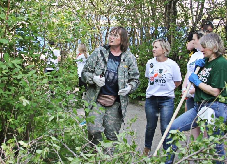 Юные экологи разбились на несколько групп. Те, что помладше, под присмотром вожатых отправились убирать мусор вокруг новой спортплощадки. Старшим доверили расчистку сквера. Это любимое жителями место отдыха. Здесь растет клен, боярышник, сирень и шиповник. В жару их тень спасает от палящего солнца, но сейчас деревья требуют ухода и обрезки. Как правильно это сделать показал профессиональный ландшафтник, он провел мастер-класс для ребят по топиарному искусству.