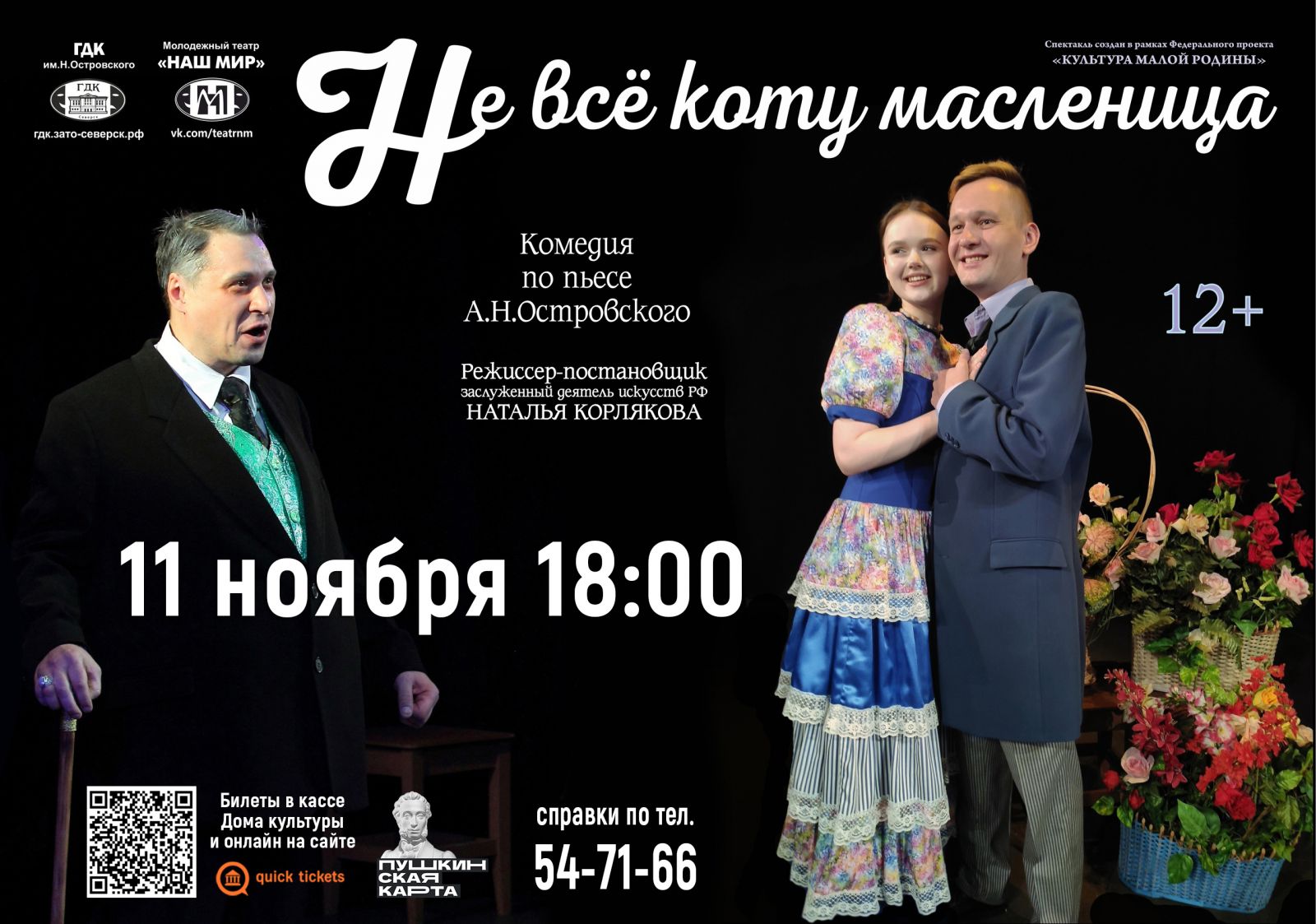 11 ноября в 18:00 в Городском доме культуры им.Н.Островского состоится показ легендарной комедии Александра Островского «Не всё коту масленица» в постановке заслуженного деятеля искусств Российской Федерации Натальи Корляковой и Молодежного театра «Наш мир».