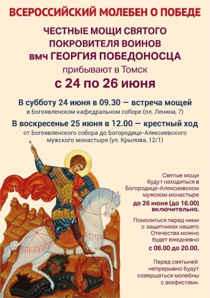 24 июня в Томск прибывают мощи великомученика Георгия Победоносца. Всероссийский молебен о Победе и справедливом мире будет совершён перед мощами святого в Томске с 24 по 26 июня.