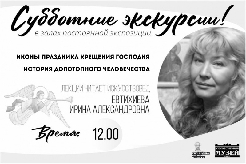 В 12:00 – экскурсия от искусствоведа Ирины Александровны Евтихиевой на темы: «Иконы праздника Крещения Господня»; «История допотопного человечества».